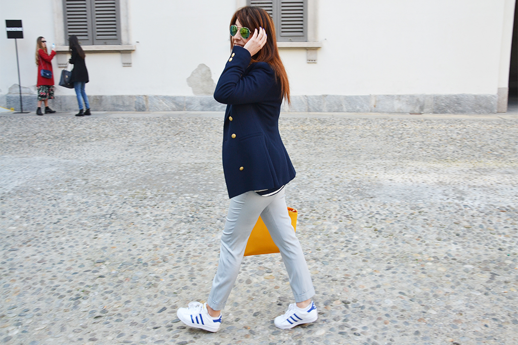 You just need to wear a pair of comfortable trousers, by a neutral nuance because if you want to realize the marine style in the best way the t-shirt has to be white and blue! Do you like mine? I matched with a jacket of the same color, a nice dark blue, but with… golden button! Why? Simply because I wanted to remind the delicious Pomikaki bag that gives, to the whole outfit, happiness, elegance (after all we need to be always glamour even if we choose to wear a casual outfit!). The leather is soft, the bag is spacious and I’m using it very often! It’s a really versatile bag that can be matched to every outfit you want to create, elegant or casual! Last detail… The famous, inimitable Stan Smith shoes that we saw worn during the Milan Fashion Week but also during other events where women – also dressed in elegant suits, minimized their look with them to be original! What do you think? I wait – as always – for your comments!
