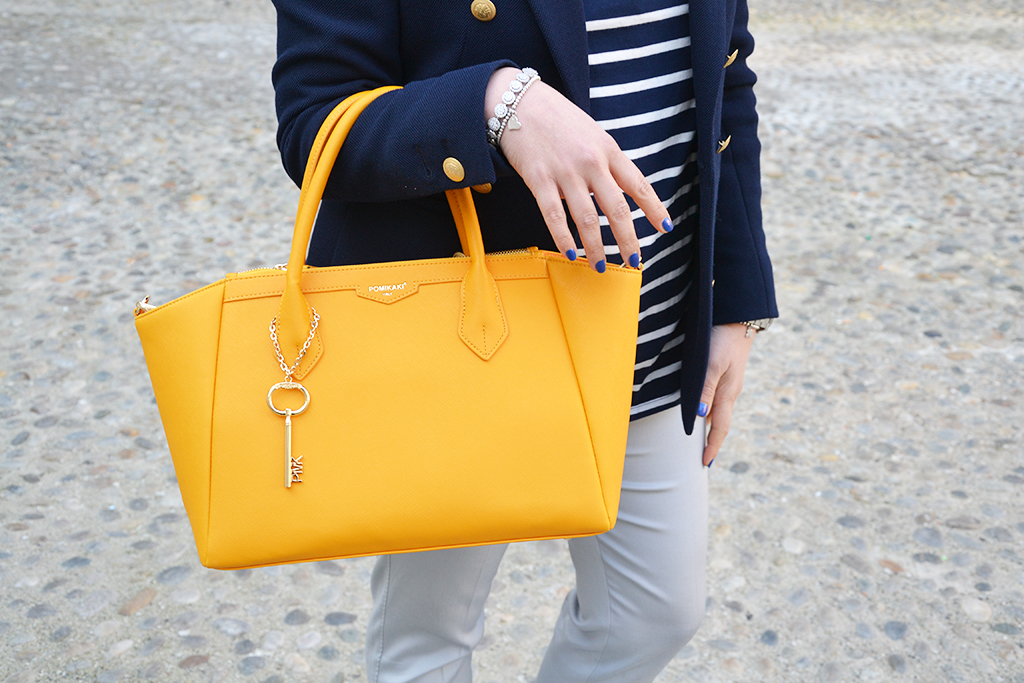 Buongiorno mie belle Zaguline! Ormai la primavera è arrivata e con lei anche i capi ‘must-have’ da sfoggiare con le amiche. Che ci crediate o meno le strisce sia orizzontali, sia verticali… meglio detto lo stile ‘marinaresco’ sono ancora molto alla moda ed eccolo qui l’outfit che ho creato per una giornata all’insegna del casual, della comodità e anche dell’allegria perché sapete molto bene che adoro dare un tocco di colore! Avete solo bisogno di indossare un paio di pantaloni comodi, dalla tinta neutra perché se volete interpretare lo stile marinaresco la maglia a strisce deve essere bianca e blu! Vi piace la mia? Ho abbinato una giacca in tinta, un bel blu scuro, ma… con bottoni dorati! Perché? Semplicemente per richiamare la deliziosa borsa di Pomikaki che dona all’intero outfit allegria, eleganza (dopo tutto bisogna sempre essere glamour anche se optiamo per uno stile casual!). Il pellame è morbido, la borsa è capiente ed io la sto utilizzando davvero spesso! È una borsa davvero versatile che può essere abbinata a qualsiasi outfit desiderate creare, elegante o sportivo! Ultimo dettaglio le famose, inimitabili Stan Smith che tanto abbiamo visto indossate sia alla settimana della moda e sia per gli eventi dove le donne vestite anche in modo elegante sdrammatizzavano il loro look con loro per essere originali! Cosa ne pensate? Aspetto come sempre i vostri commenti!