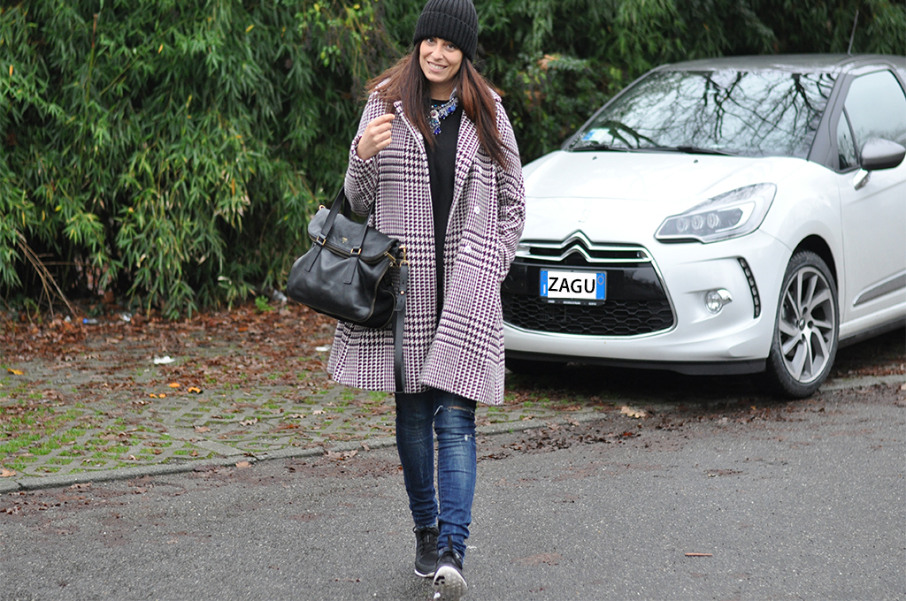 EN Here I am Zaguline to introduce you the last born of Citroen that has taken me, in these days, around Milan! The new Citroen DS3 car with an unique and very elegant design! The real news is that you can personalize it as you like choosing the bodywork and the roof color, the light-alloy wheels and the coatings of the seats available in very glamour and fashion kinds. It has Xeno Full LED headlights and 3D LED rear lights and LED day headlights. The engine is in compliance with the Euro 6 laws and it has a navigation system eMyWay very innovative, HiFi system, Bluetooth, USB and Jack. The super comfortable seats and the sports steering wheel are really stunning… My dear I’ve tried the Sedan, very versatile with a length of 3,95 meters, 5 seats and a trunk of 285 liters! If you go on Citroen website you can book a test drive and try this car really unique in its gender…! And what about my outfit? A black and white coat, a pair of jeans, sneakers on feet and a warm wool hat… and you’re ready for a shopping day!