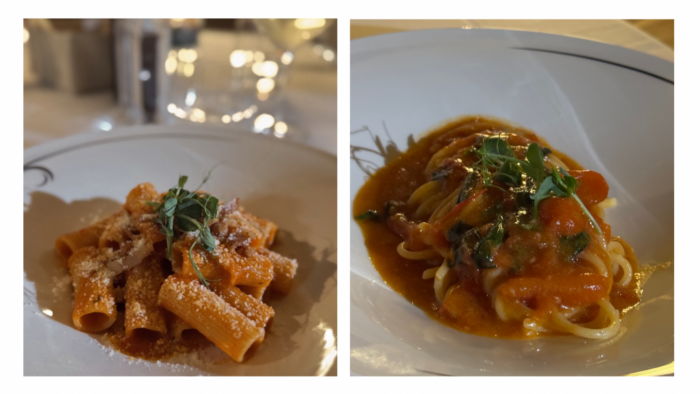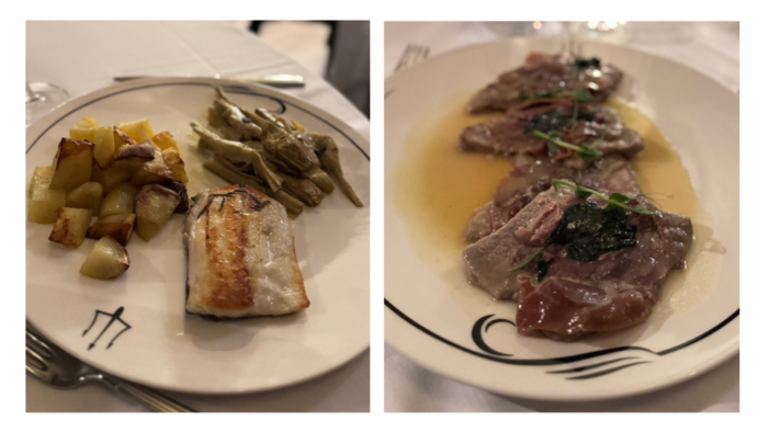 Durante la serata, ho avuto il piacere di provare piatti che spaziano dalla cucina romana alle specialità di mare. Ho iniziato con la amatriciana, un classico piatto romano dal sapore deciso, seguito dagli spaghetti ai 3 pomodori, che esaltano la freschezza dei pomodori in modo semplice ma ricco di gusto. Poi, ho optato per un piatto che non può mancare nella tradizione romana: i saltimbocca alla romana, con una carne tenera e saporita, mentre il mio compagno ha scelto la spigola freschissima, servita con patate e carciofi, un piatto che spicca per la sua delicatezza e freschezza.