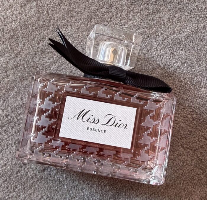 Il flacone di Miss Dior Essence è una reinterpretazione moderna del design originale creato nel 1948 da Christian Dior. Presenta un motivo pied-de-poule effetto ghiaccio e un fiocco in gros-grain nero, simbolo di eleganza e couture. Il tappo in vetro trasparente conferisce un tocco di lusso e raffinatezza.