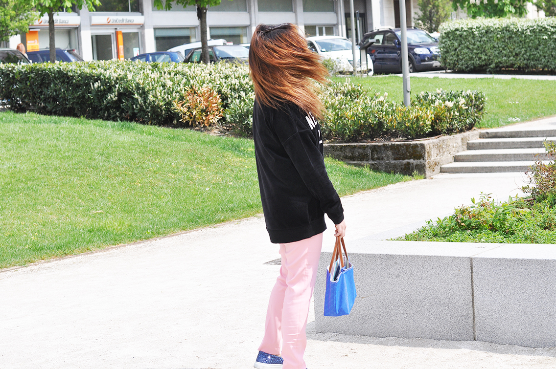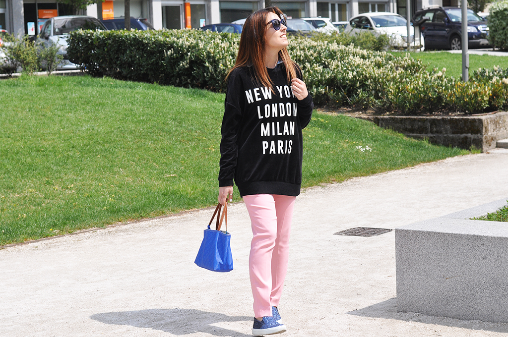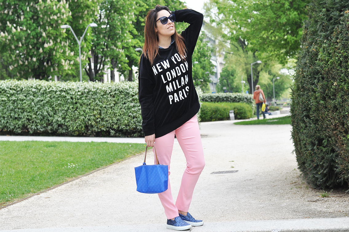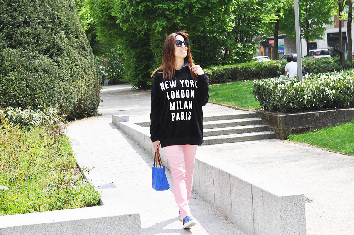 This time the protagonist are them, the slip-on Sneakers, the comfortable, without laces shoes that I bought on Internet. If you have a look on the official website of Sarenza you’ll have spoiled for choice! That are with glitters as mines, zebra-stripes, spotted or one color.. the slip-on is the ideal accessory ables to give that little touch for realizing an original outfit! I’ve matched them wearing a funny sweatshirt with printed on my favorite destinations and a pair of soft, pink trousers of Maria Grazia Severi. And what about my Gherardini bag? It’s little, practice, casual. Ideal for having whatever you need with you! I wait – as always – for your comments! I go to visit the Expo and you?